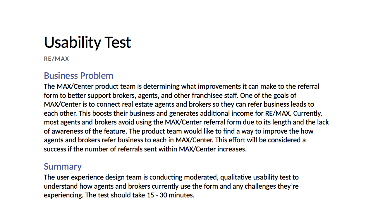 For this project, I decided to conduct qualitative moderated usability tests on the current referral process in MAX/Center so I could understand how brokers and agents approach referring homebuyers to each other, what was working well with the form in that process, and what needed to be improved. Watching them talk through using the live form and asking follow-up questions would be the best way to get this information.